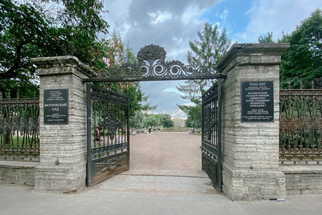 Ограда Юсуповского сада вдоль Садовой улицы в целом сохранила первоначальный облик, хотя её протяжённость сократилась. Чугунная ажурная решётка длиной 241 м и высотой 1,5 м установлена на высоком каменном цоколе. Первоначально она включала центральные двустворчатые ворота (шириной 3,2 м) и две боковые калитки (по 0,93 м), установленные между столбами. Решётка оформлена чередующимися вертикальными и ромбовидными стойками с декоративными элементами: розеттами, пальметтами, волютами, фризами с меандром. Створки ворот украшены фрамугой с вазой и лавровыми ветвями, а также филёнками с пиками, лентами и венками.