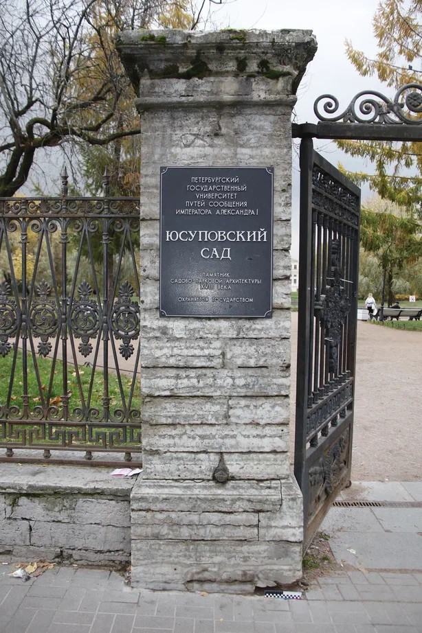 Ансамбль дворца Юсуповых (Санкт-Петербург, Московский проспект, д. 9, лит. Б) является объектом культурного наследия федерального значения на основании Постановления Правительства Российской Федерации «О перечне объектов исторического и культурного наследия федерального (общероссийского) значения, находящихся в г. Санкт-Петербурге» № 527 от 07.10.2001 г. В состав ансамбля входит объект культурного наследия «Ограда с воротами» (Санкт-Петербург, Садовая ул., д. 50-а). Чугунная ограда выполнена по проекту инженеров В. Трофимовича и К. Кольмана. Ограда была возведена в 1836-1840 годах.