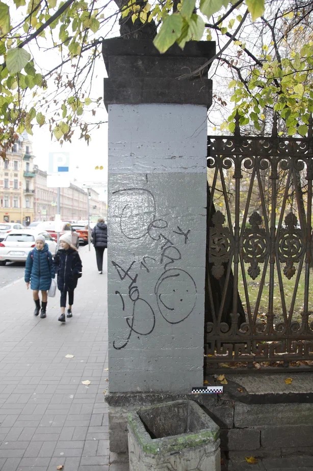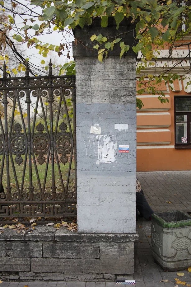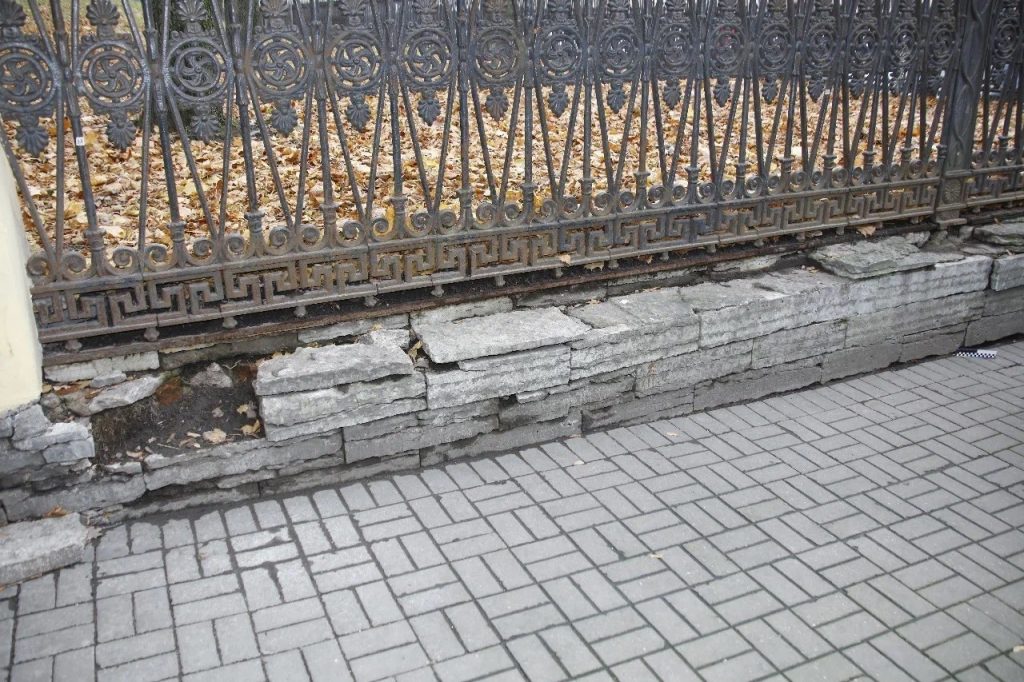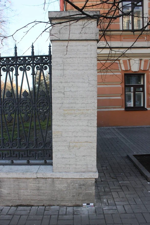 Очистка поверхности цоколя и столбов от ремонтных вставок и всех видов загрязнений. Демонтаж и транспортировка в реставрационные мастерские наверший столбов центрального входа. Укрепление камня. Восполнение крупных и мелких утрат, поверхностных дефектов камня методом мастиковки и изготовлением вставок из аутентичного материала. Заделка широких трещин в камне. Восстановление утрат шовного раствор. Консервация поверхности камня. Гидроизоляция подземной части ограды.