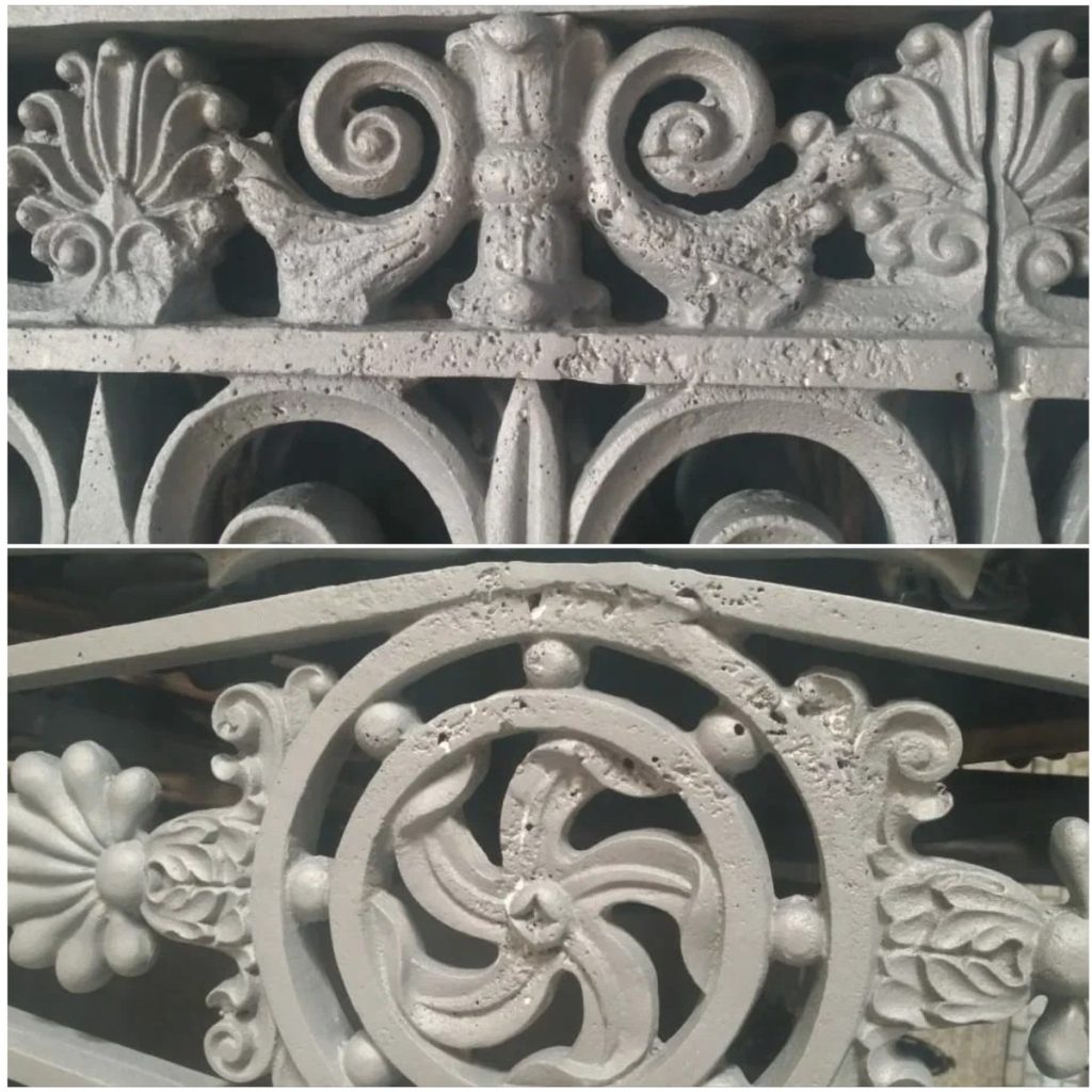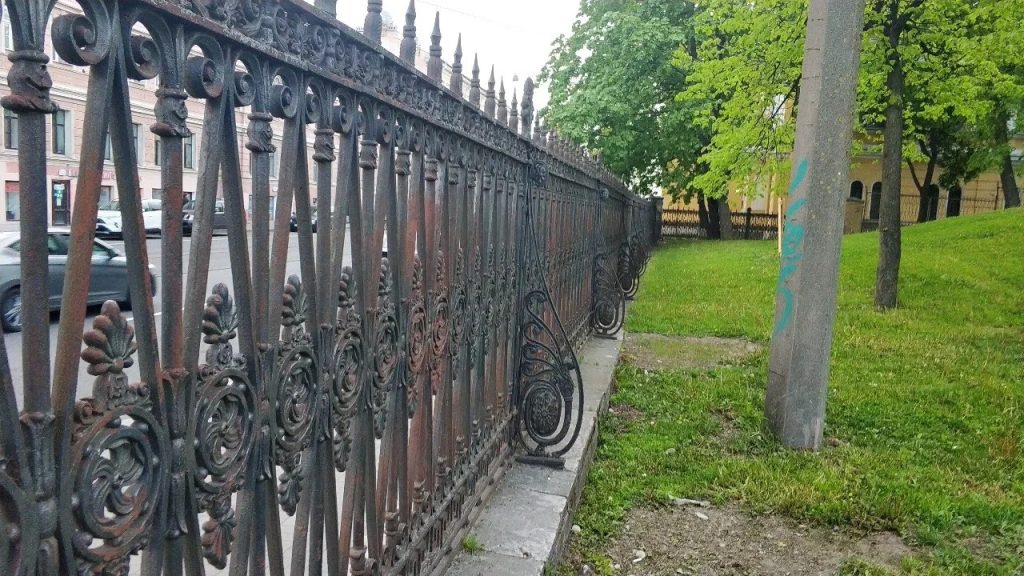 Демонтаж металлических элементов ограды и ворот, транспортировка в реставрационные мастерские, разборка по узлам и деталям, снятие поврежденных и деформированных деталей с утратами фрагментов. Расчистка поверхности от ЛКМ и продуктов коррозии. Воссоздание утраченных чугунных элементов ограды и ворот методом художественного литья по модели. Реставрация и воссоздание крепежных элементов, обеспечивающих прочность конструкции. Реставрация и восполнение утрат основы (мелкие сколы), устранение дефектов литья (корольки, непроливы) методом мастиковки. Сборка металлических конструкций согласно проектному решению, разработанного на основании исторической схемы крепления с воссозданием утраченных кованых фрагментов верхней тетивы в местах крепления к столбам. Грунтование и окраска поверхности. Монтаж металлических конструкций используя историческую схему крепления с выбраковкой и заменой крепежных элементов.
