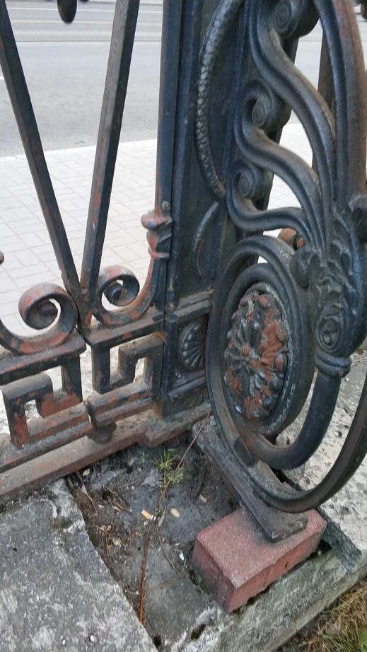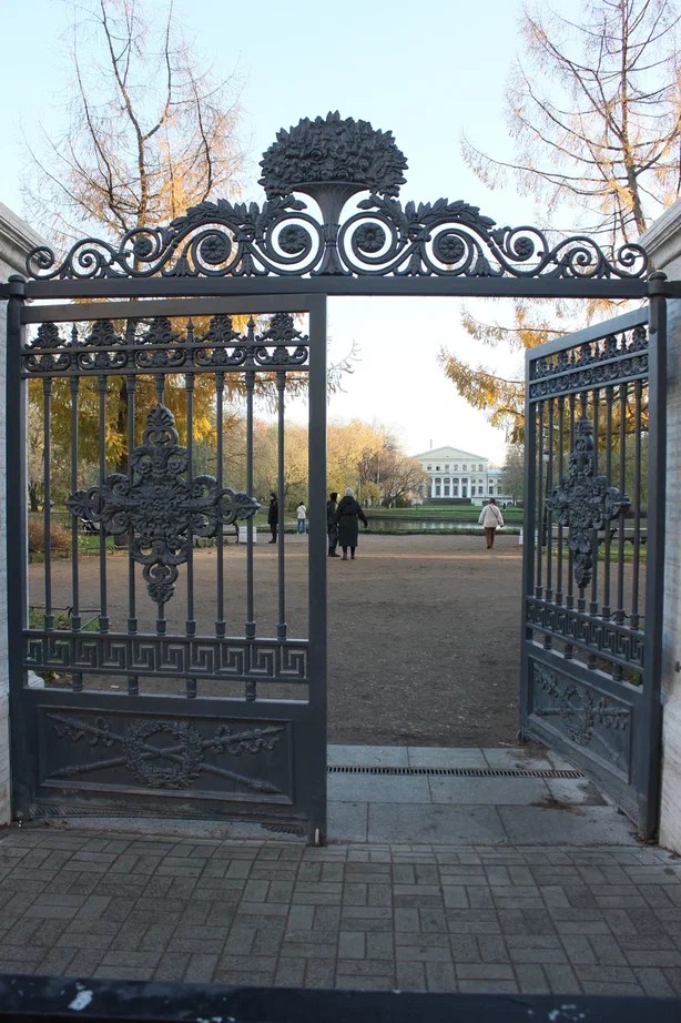 Декор ворот отличается от чертежа 1836 года, но соответствует поздним фотографиям. Первоначально решётка была окрашена в серый цвет. Известно, что с 1863 года со стороны сада она была обшита деревом и выкрашена масляной краской. Впоследствии, при строительстве рядом зданий, конфигурация ограды неоднократно менялась, восточная часть была демонтирована, калитки исчезли. В советское время проводились ремонты, капитальная реставрация состоялась в 1954, затем — в 1979 и 1990-х годах.